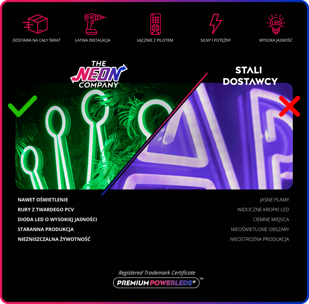 Dzięki ponad 10-letniemu doświadczeniu The Neon Company stała się jedną z największych firm neonowych na świecie. U nas wybierzesz trwałe i klimatyczne Neony wyposażone w naszą własną, technologię PowerLEDs®. Z racji tego, że produkcja naszych neonów odbywa się we własnym zakresie, gwarantujemy zawsze najniższą cenę. Personalizacja Neonu nigdy nie była tak przystępna i łatwa. Zapytaj o wycenę, zaprojektuj swój własny neon lub odwiedź nasz sklep internetowy.